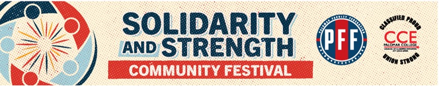 Staff and Faculty from Palomar College are joining forces to invite you to be part of something powerful. The Solidarity & Strength Community Festival is more than an event, it's a vibrant gathering of community, culture, and connection. We're bringing together students, families, workers, and neighbors for a high-energy day filled with music, art, and celebration.